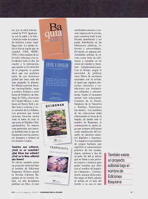 En efecto, también existe un proyecto editorial bajo el nombre de Ediciones Baquiana. Primero surgió la Revista Literaria Baquiana en su versión virtual. Al año decidimos publicar un libro, el cual nombramos anuario o versión impresa de la revista, para conservar todo lo publicado anualmente y así poder distribuirla en las bibliotecas públicas, librerías y universidades. De hecho, en algunas universidades utilizan la revista como texto de referencia y consulta en las clases de español y literatura hispanoamericana.