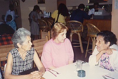 Sosteniendo una charla intensa y entretenida con las escritoras dominicanas Hilma Contreras y Aída Cartagena Portalatín antes del almuerzo. Santo Domingo, República Dominicana. |