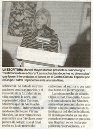 La escritora Maricel Mayor Marsán vio sus monólogos Testimonio de mis días y Las muchachas decentes no viven solas interpretados el jueves en el Centro Cultural Español por el Grupo Teatral Capricornio ante una sala llena. Son dos de las seis piezas de su libro Gravitaciones teatrales (Ediciones Baquiana), que presentaron previamente los escritores René Rodríguez Soriano y Leonardo Fernández Marcané.