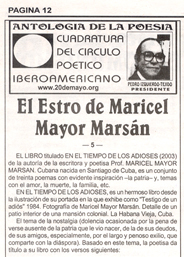He leído con fruición el brillante poemario EN EL TIEMPO DE LOS ADIOSES de Maricel Mayor Marsán de la Editorial Áglaya en Cartagena, Murcia, España. Después de la lectura e interpretación de sus poemas, éste me pareció un libro extraordinario. En el panorama de nuestra poesía, todos estos adioses −en su tiempo− de una forma u otra nos transporta a la añorada y sufrida Cuba, y pienso que todos los de nuestra tierra sienten en igual la profundidad de sus ideas expresadas en un lenguaje claro y preciso. Su estro está a la vanguardia del verso libre −verso suelto o verso blanco− tan practicado a partir de la segunda mitad del siglo XX y tan usado en los poetas de Iberoamérica.
