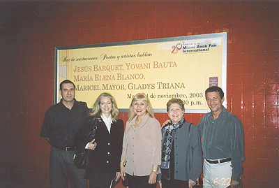 Jesús J. Barquet, María Elena Blanco, Maricel Mayor Marsán, Gladys Triana y Yovani Bauta en la XX Feria Internacional del Libro de Miami. (Noviembre de 2003) |