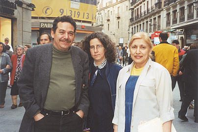 El escritor cubano Alejandro Lorenzo, la escritora portuguesa Paula Amaral y Maricel Mayor Marsán en la Puerta del Sol. Madrid, España. (Marzo de 2002) |